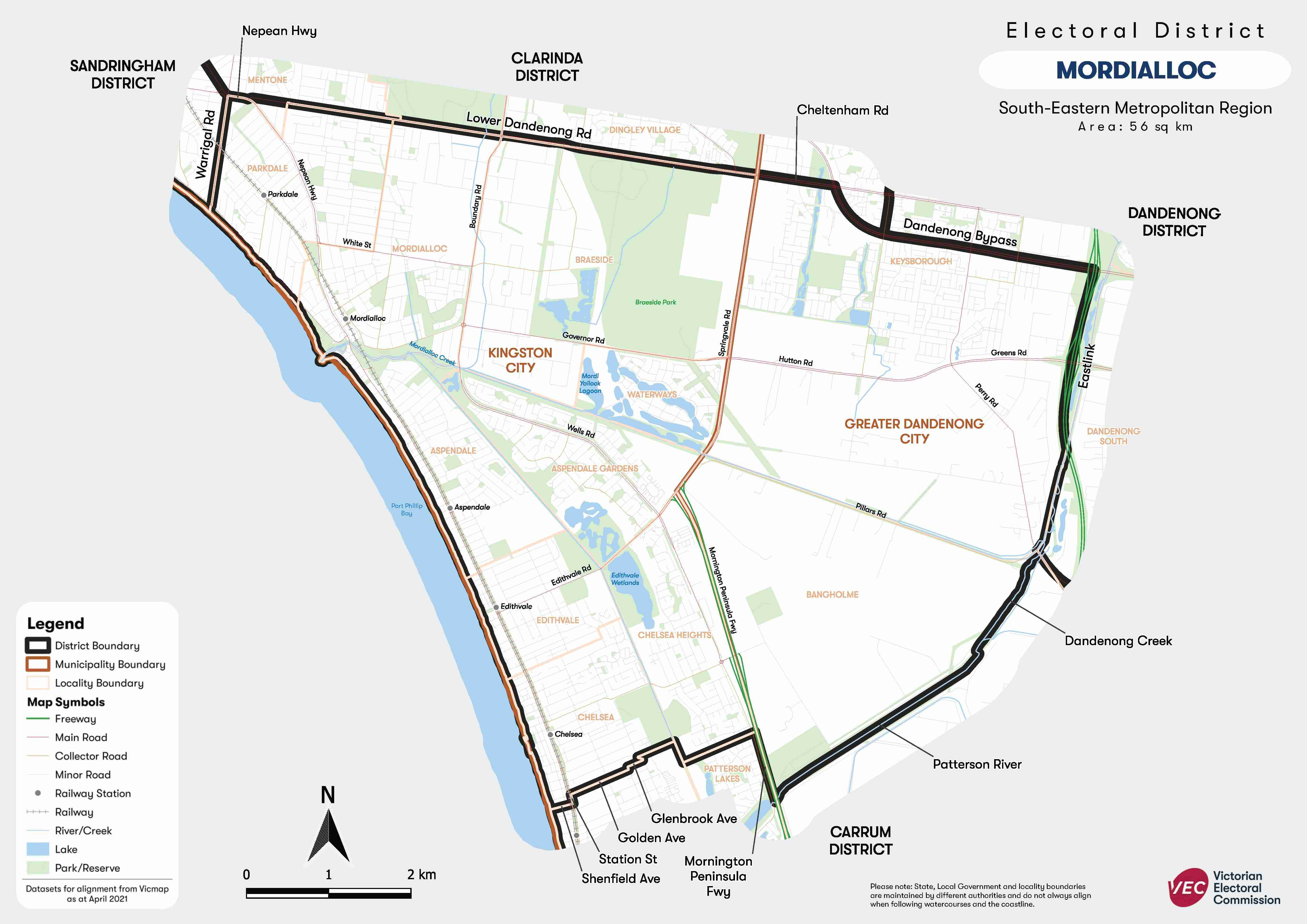 It is a metropolitan electorate located approximately 18 kilometres south-east of Melbourne, with an area of 38 square kilometres. It encompasses the suburbs of Aspendale, Aspendale Gardens, Chelsea, Chelsea Heights, Edithvale, Mordialloc, Parkdale and Waterways along with parts of Keysborough.